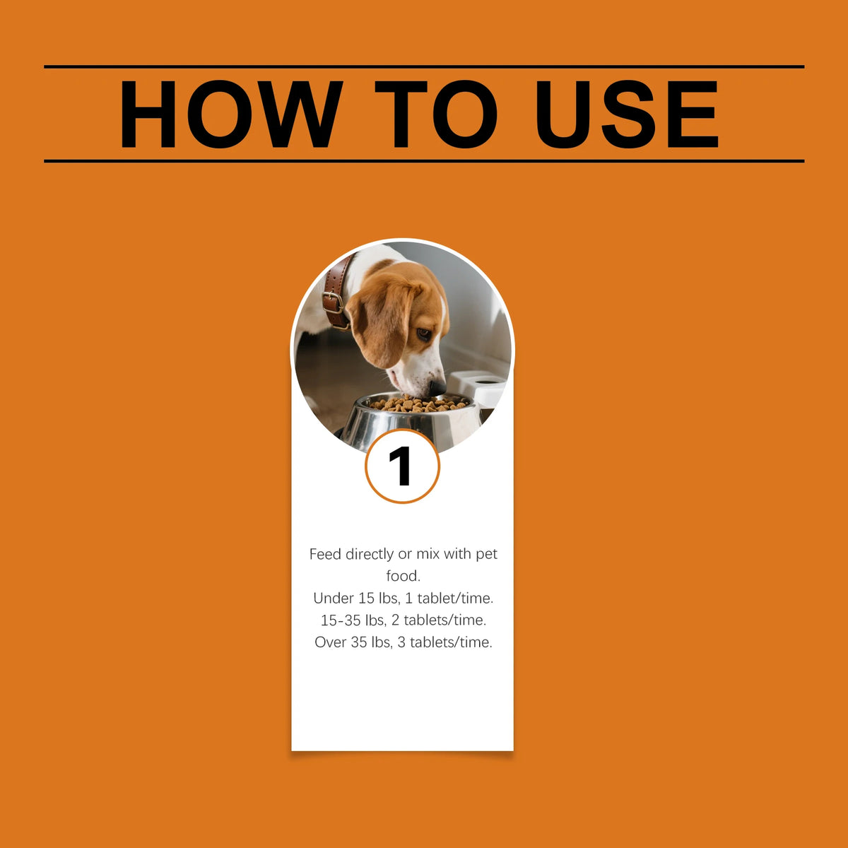 - Determine the daily dosage based on your pet’s weight: Under 15 lbs - 1 tablet per day; 15~35 lbs - 2 tablets per day; Over 35 lbs - 3 tablets per day.